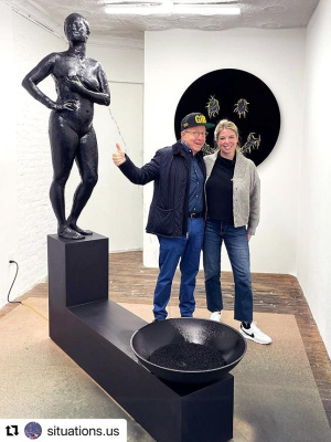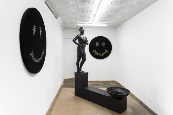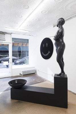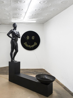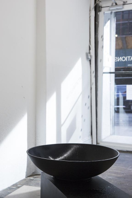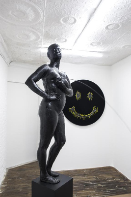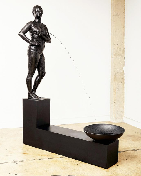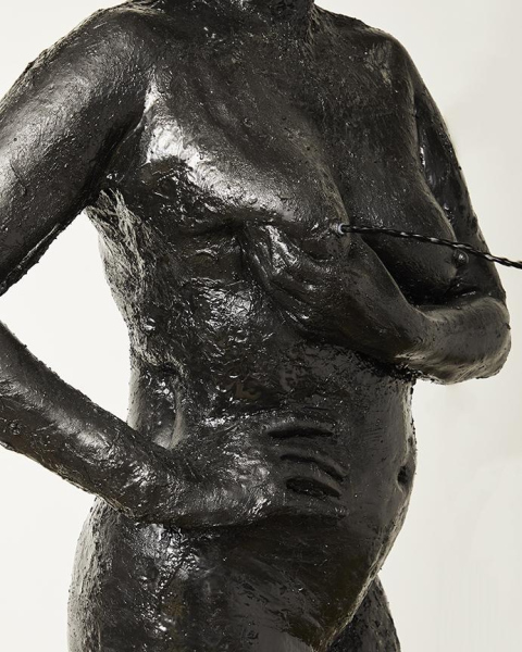 Life casts of the artist in her own formulated ink are built up in layers and dried. The ink surface may still be used as pigment with water and heat. The medium for her pigment is organic - animal gelatin - and custom mixed carbon black. Liquid ink emerges out of the dried ink sculpture at its breast nipple.
