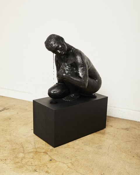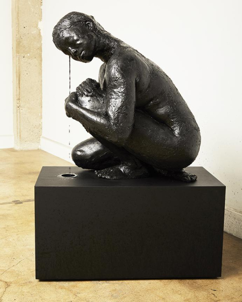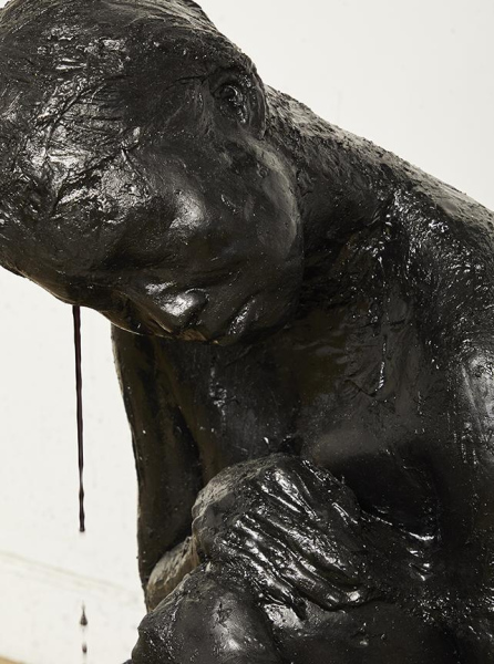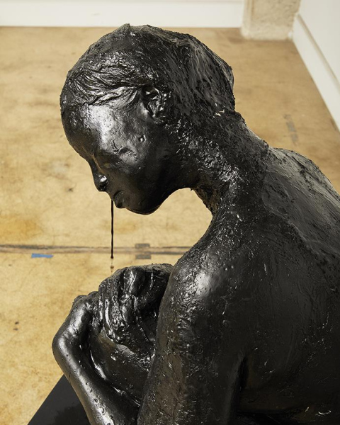 Life casts of the artist in her own formulated ink are built up in layers and dried. The ink surface may still be used as pigment with water and heat. The medium for her pigment is organic - animal gelatin - and custom mixed carbon black. Liquid ink emerges out of the dried ink sculpture at its temple.