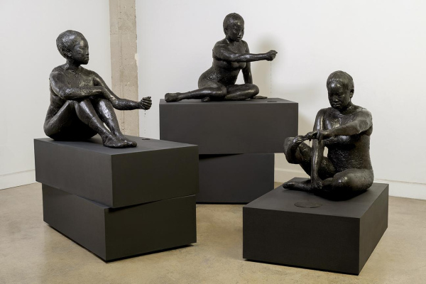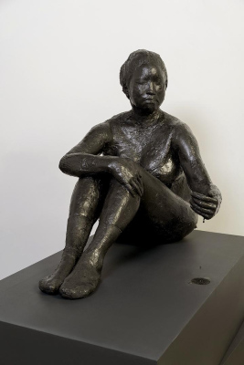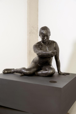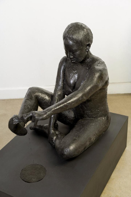 Life casts of the artist in her own formulated ink are built up in layers and dried. The ink surface may still be used as pigment with water and heat. The medium for her pigment is organic - animal gelatin - and custom mixed carbon black. Liquid ink emerges out of a hand of each dried ink sculpture.