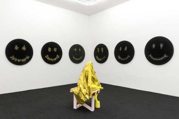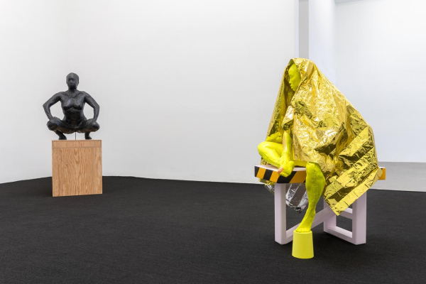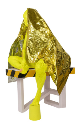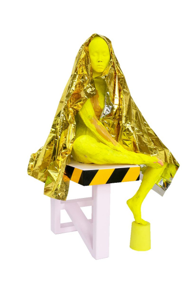 Life casts of the artist in her own formulated ink are built up in layers and dried. The ink surface may still be used as pigment with water and heat. The medium for her pigment is organic - animal gelatin - and custom mixed with a fluorescent yellow powder pigment instead of the traditional carbon black for her self-portrain.